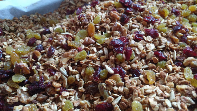 אחרי 15 דקות, מוציאים לרגע מהתנור ומוסיפים את הצימוקים והחמוציות – מערבבים היטב