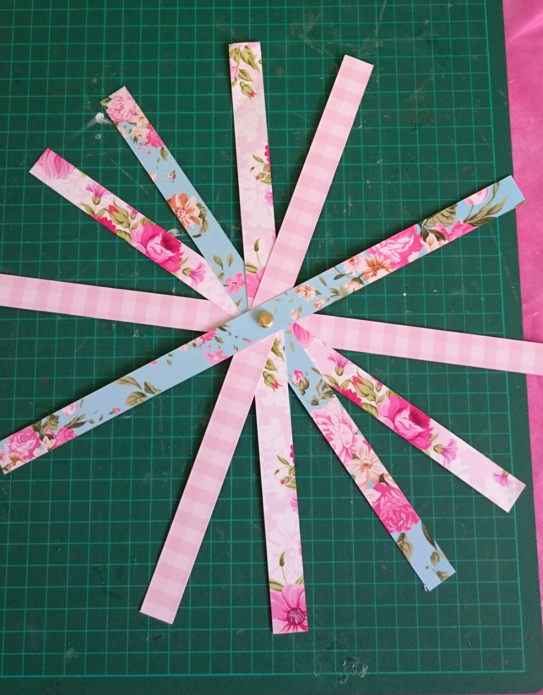 בזהירות, בלי קפל, מדביקים את הרצועות לעיגול, לפי הסדר, לפעמים זה יושב אחד על השני.