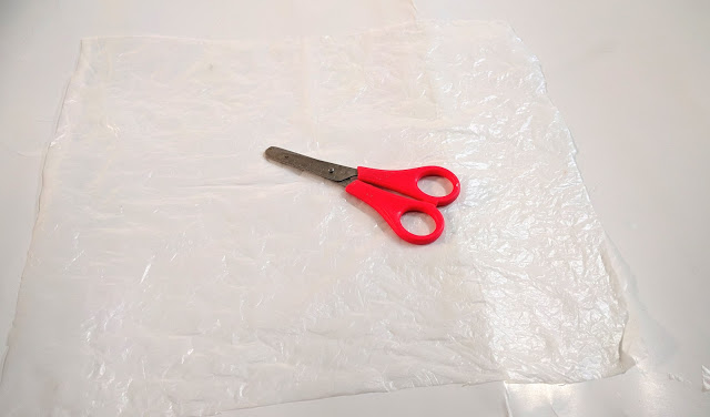 בעזרת המספריים גוזרים ריבוע משקית פלסטיק.