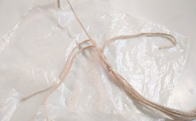 לכל פינה של השקית, מחברים שרוך של חוט צמר בעזרת נייר הדבק.