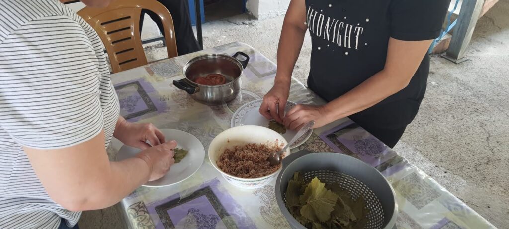 תוך שניות ספורות, מתייצבת אמירה עם סיר אורז מתובל (הבטחתי לאמירה לא לגלות את סוד התיבול, תצטרכו לנסוע לסדנא אצלה), ואנחנו מתחילות לגלגל ביחד את עלי הגפן.